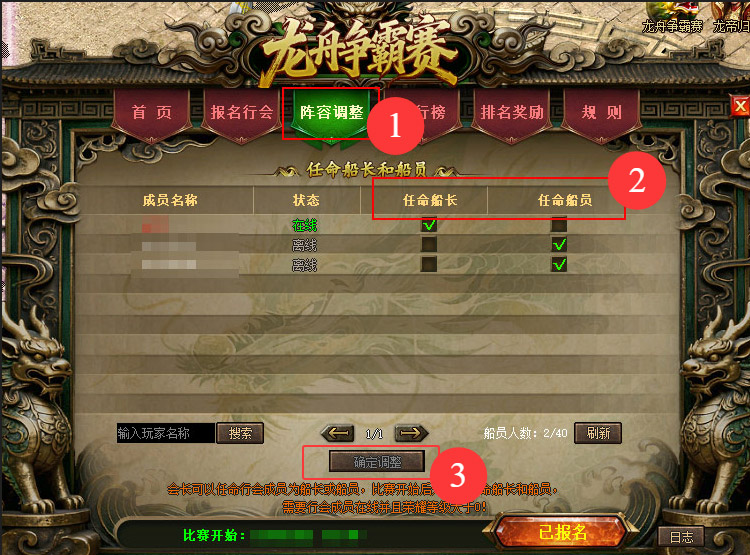 赛前:船长可直接在“龙舟争霸赛”活动面板的“阵容调整”界面中,完成任命和人员调整。